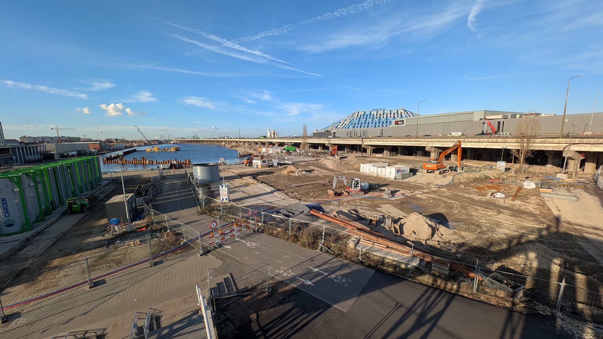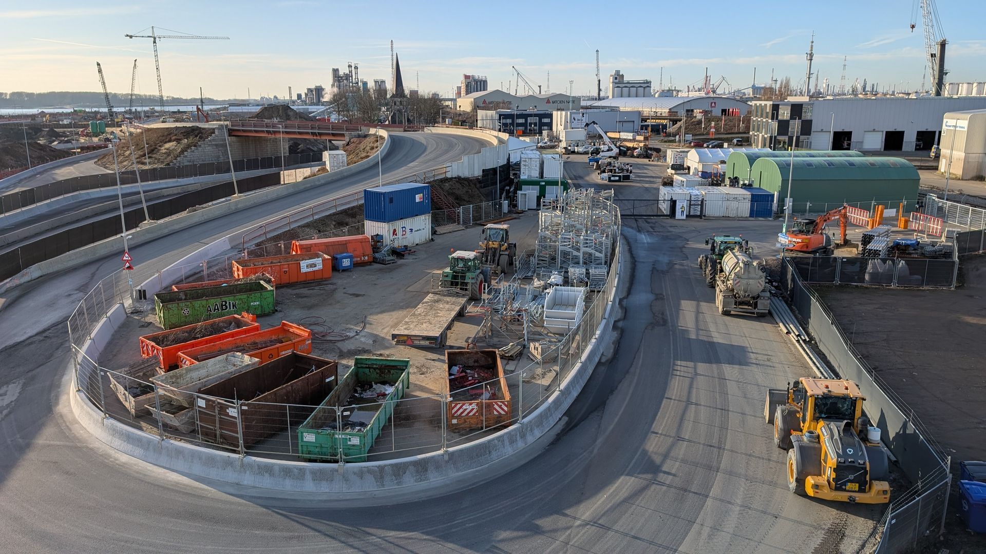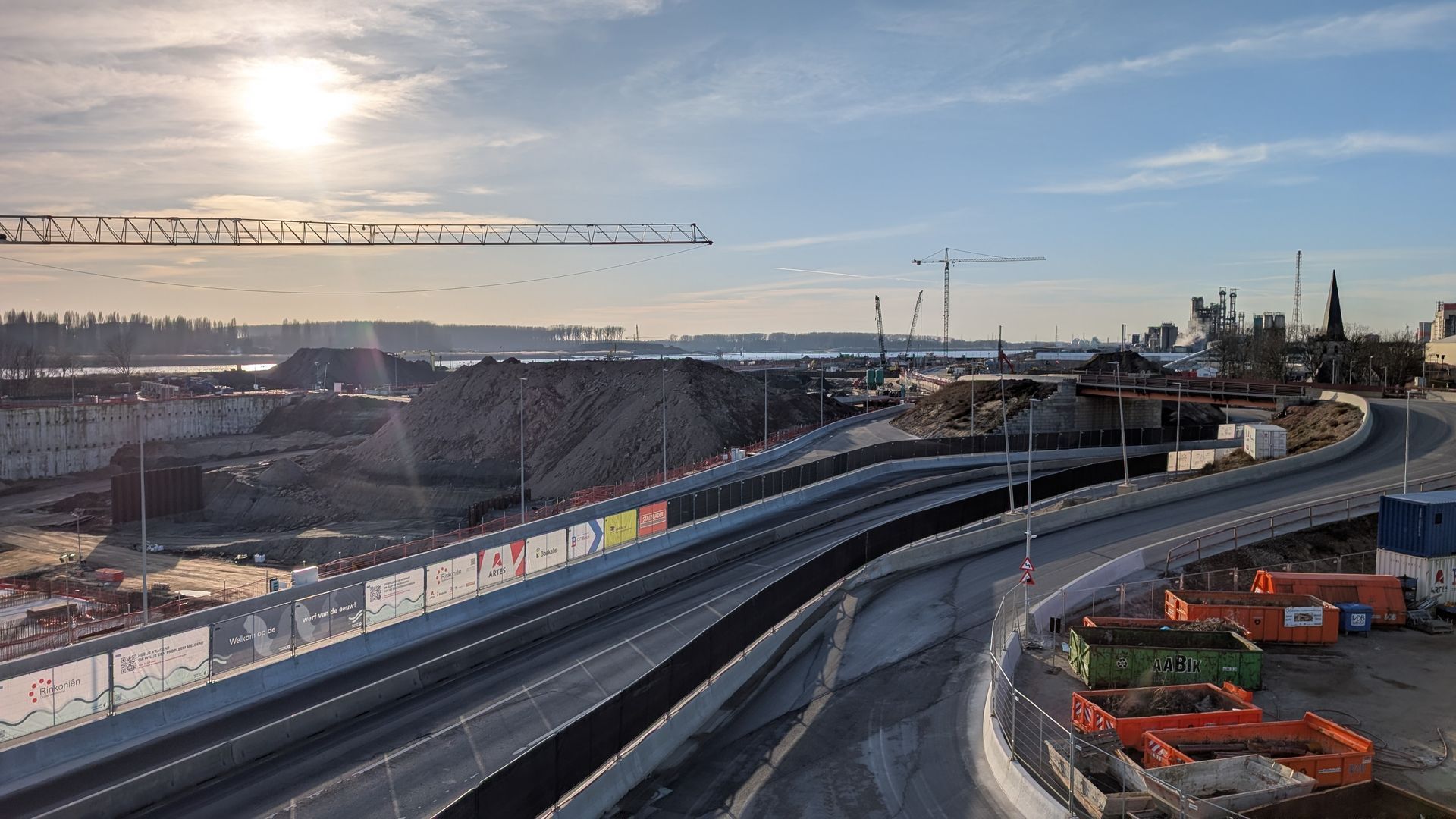 Leaving the city behind, we drive straight into the heart of the construction zone, crossing a bridge that reveals how water and earth are quite literally being moved to create new connections. Along the way, we pass the massive concrete plant where thousands of tonnes of material are produced, underscoring the industrial scale required to make this project possible.