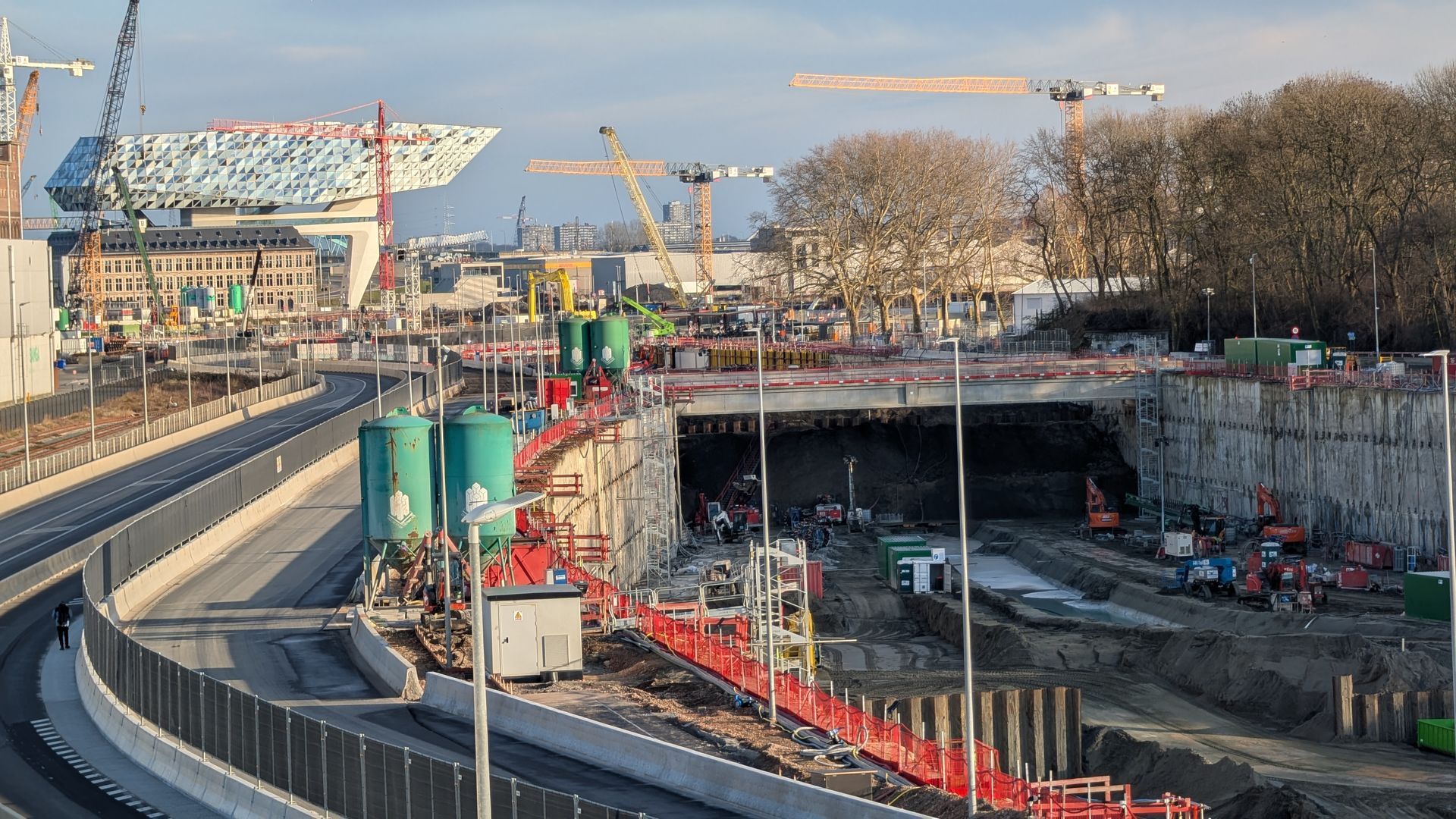 We drive through the outskirts of town, areas soon to be absorbed by the expanding city through the Oosterweel project, and arrive near the iconic Sportpaleis, now known as the Afas Dome. Here, the ring road around Antwerp undergoes its most delicate operation: a complex system of bypasses and temporary routes that keep the vital artery of city and port flowing, while the ground quite literally trembles beneath one of the most challenging phases of the works.